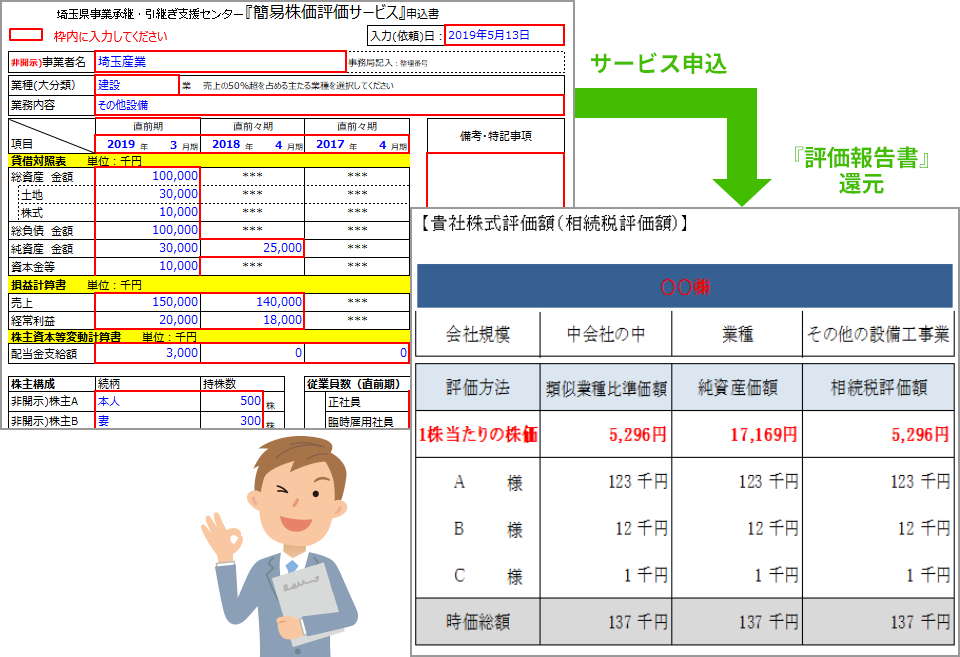 本サービスは、埼玉県事業承継ネットワーク事務局が、貴社の株価の目安を把握していただくことを目的に、下記の税理士法人・会計事務所と連携しご提供するサービスです。